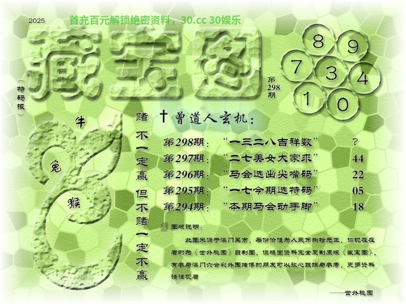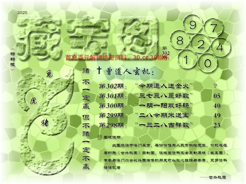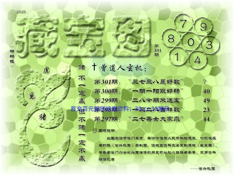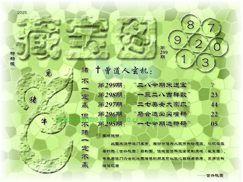 299期藏宝图曾道人玄机:二八今期来送宝 解:二八今期,02龙,08狗,来送宝,解吉肖龙马羊兔蛇鸡 解特肖:龙狗马羊兔蛇鸡 |